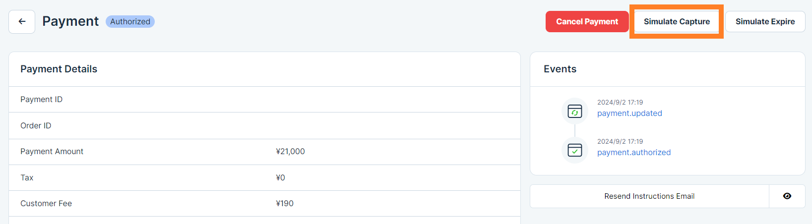 *By clicking 【入金】button, you can change the transaction status to 'Captured'.