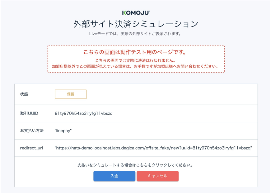 However, if you use the test mode, the deposit simulation screen will be displayed without transitioning to the app.