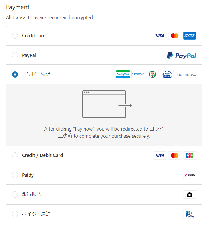 After setting up, you will be able to select the KOMOJU payment method as shown below on the Shopify checkout page.