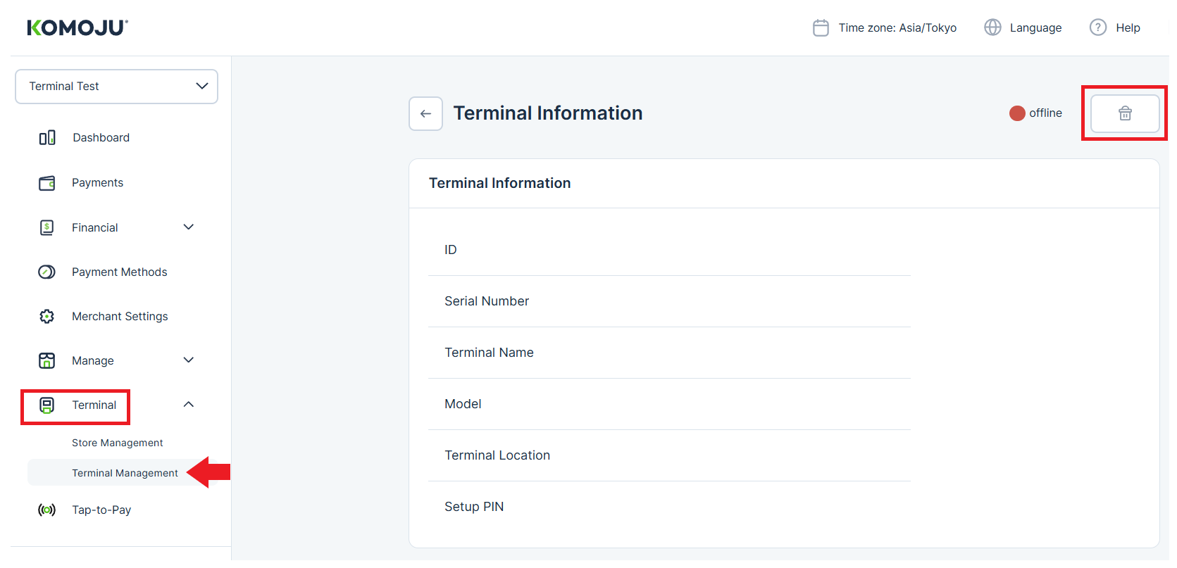 - Press the Trash can symbol to delete the terminal. (See attached).