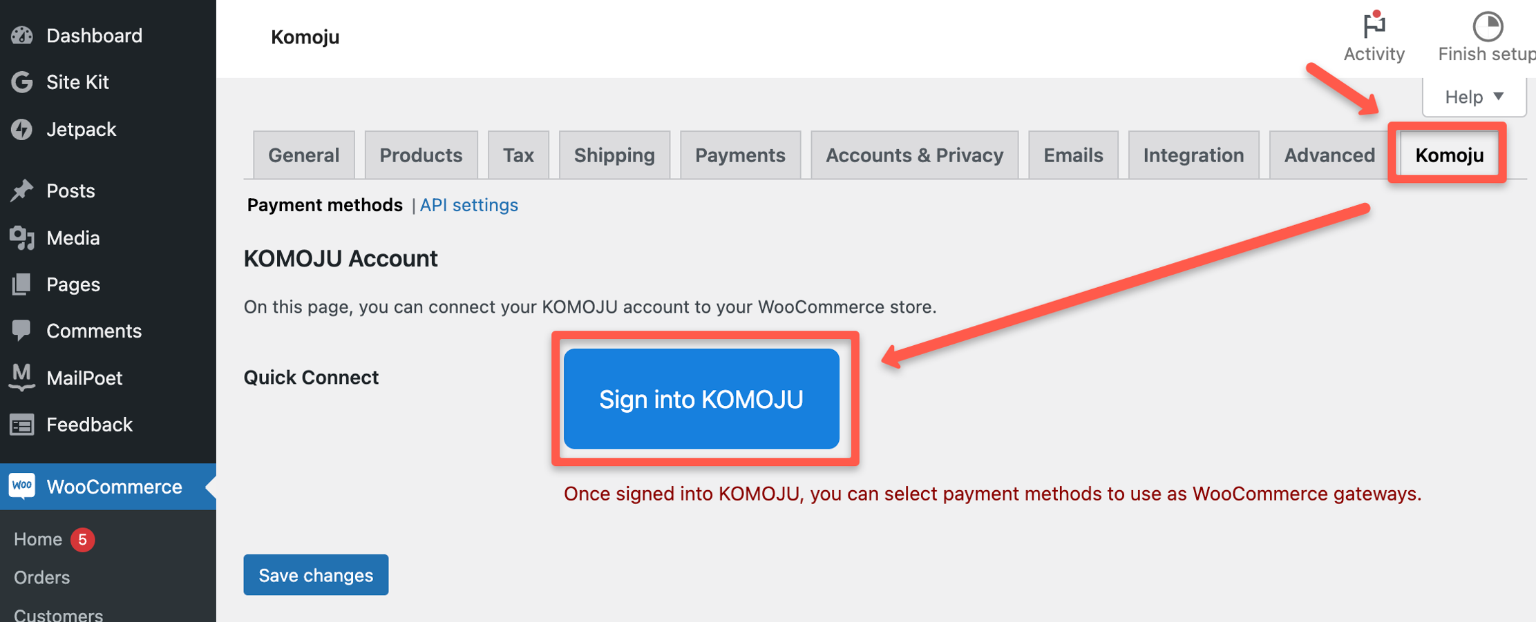 To do this, you must authorize with KOMOJU from the KOMOJU tab of WooCommerce in the Wordpress administration page.