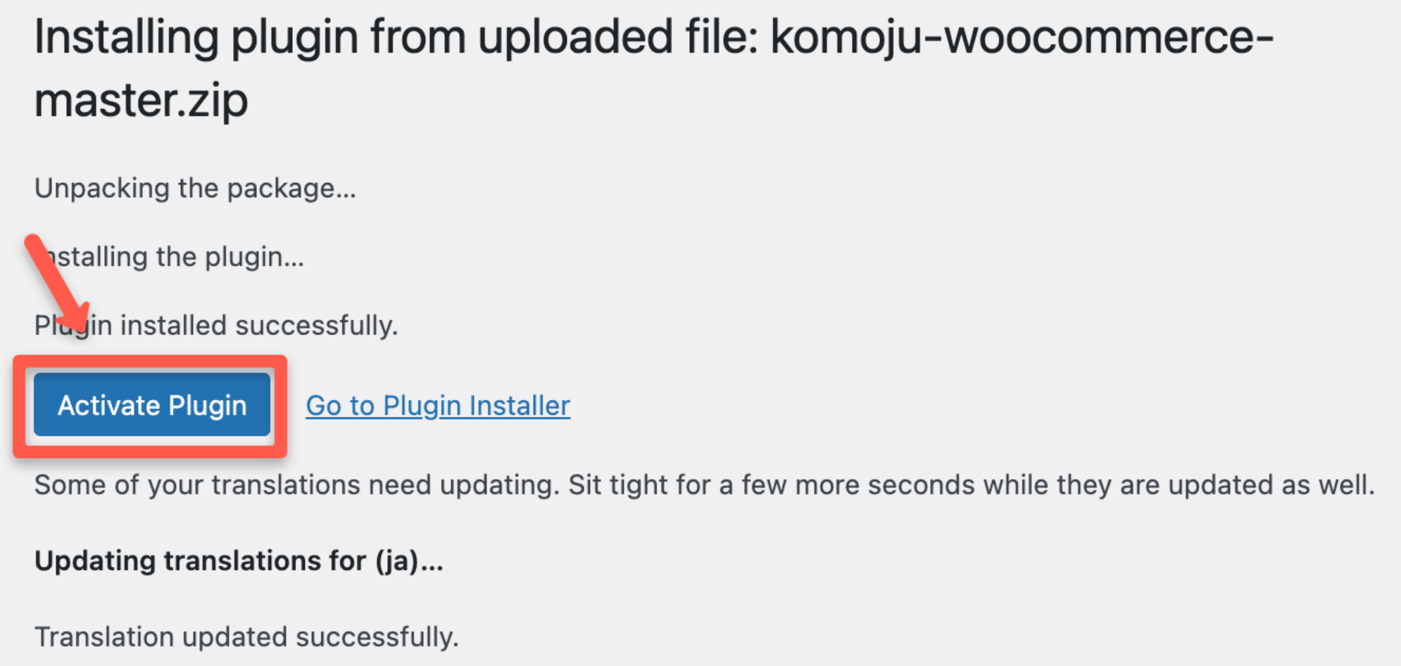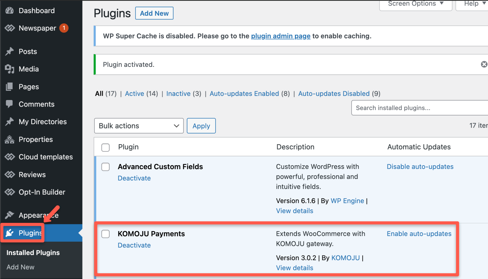 Re-click on 'Plugins' and if the KOMOJU Payments plugin is displayed & the deactivate link is shown, then you have successfully installed KOMOJU.