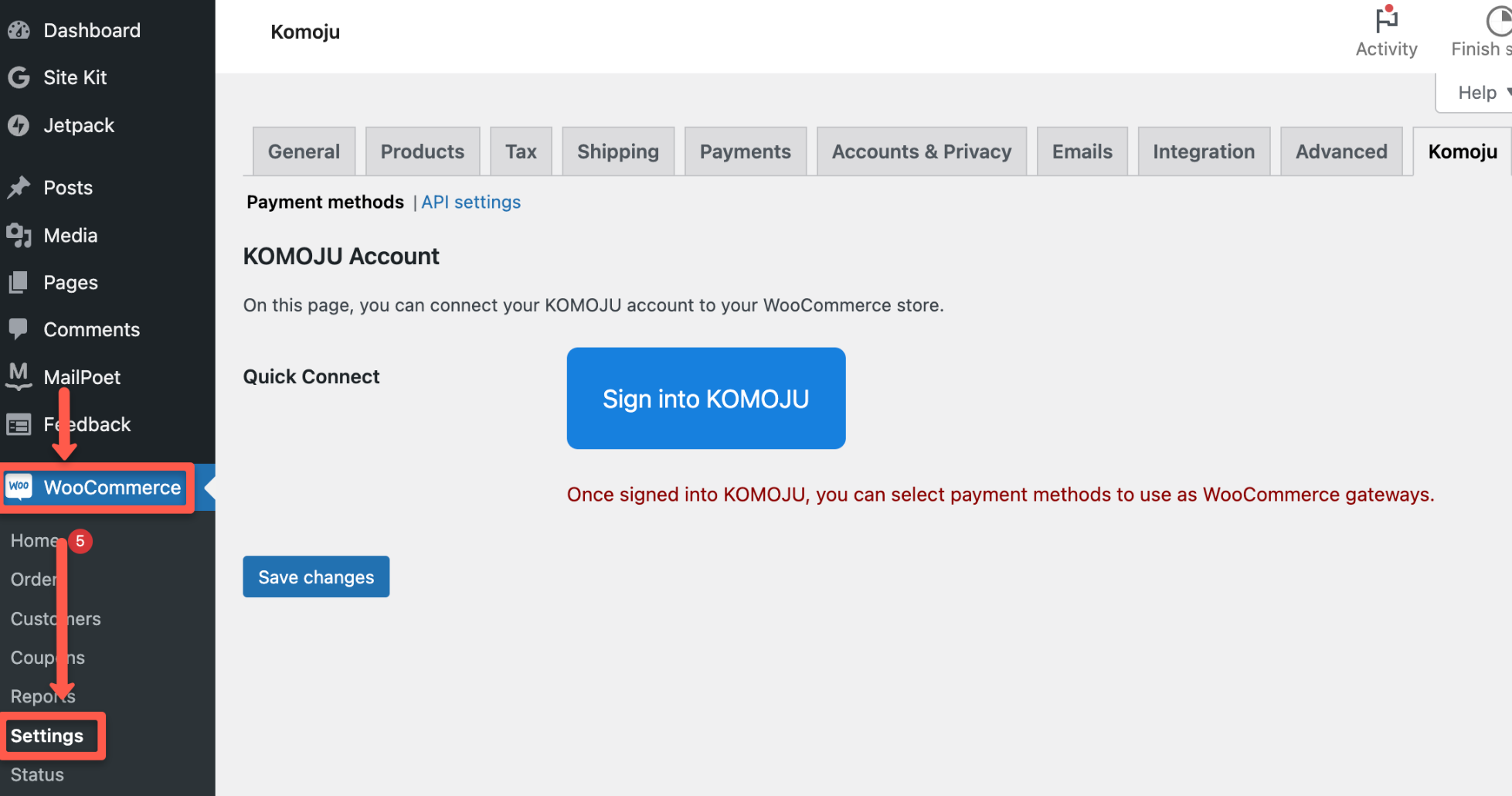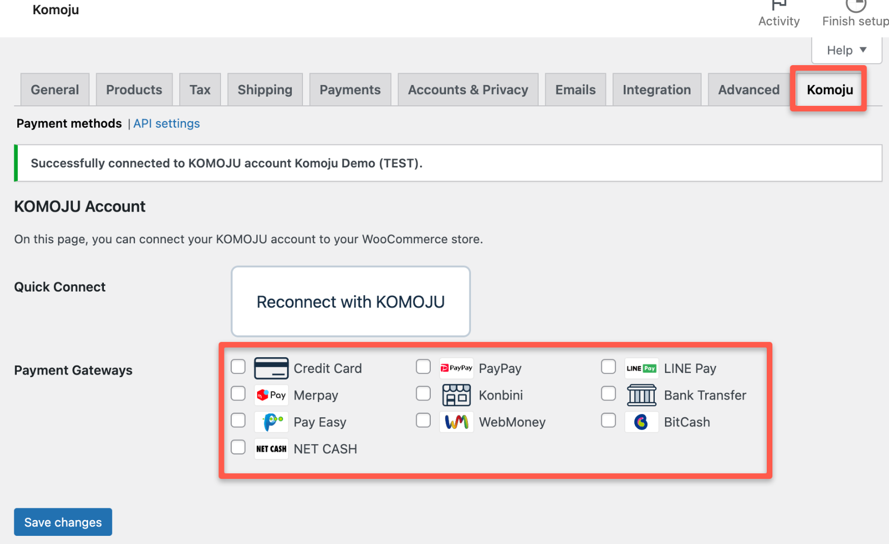 You will be redirected to the WoredPress / WooCommerce admin page, and if the payment methods are displayed on the Komoju tab, you have successfully completed the setup process.