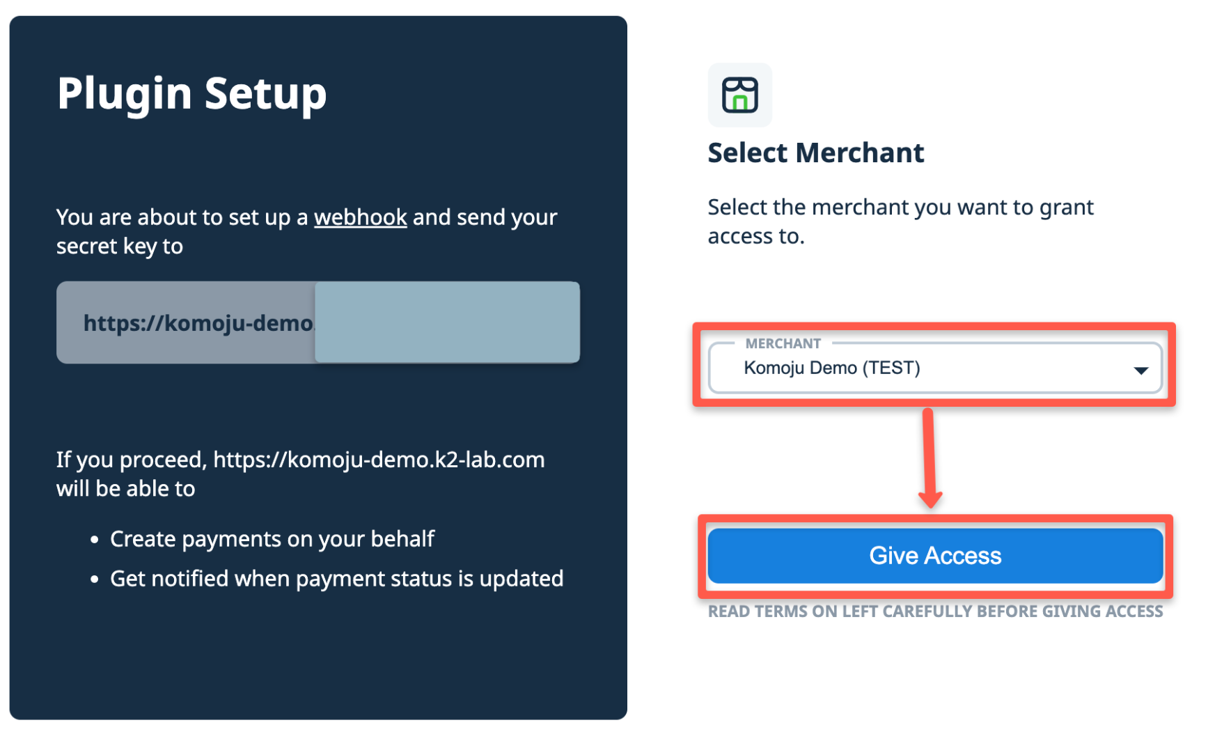 After logging in, you will be able to select the account you set up in KOMOJU, so please select the account and click 'Give Access'.