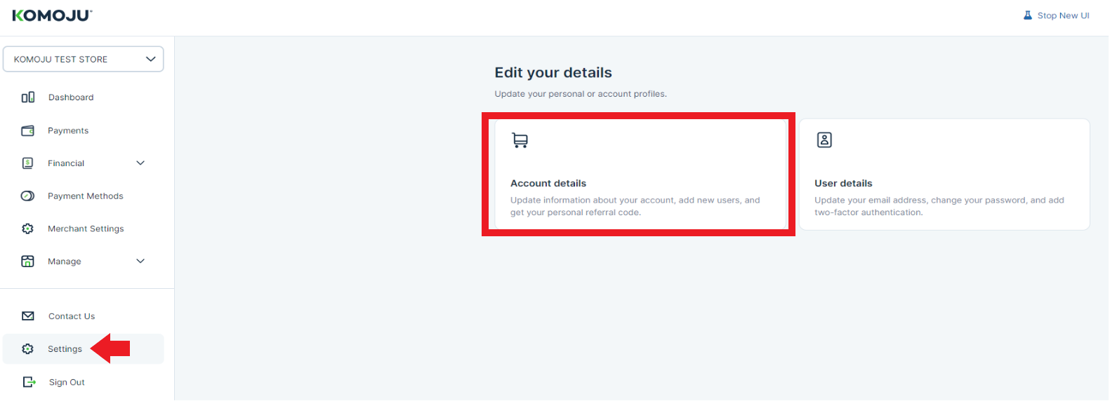 Log in to KOMOJU and click on " Settings" from the left menu bar and choose "Account details".