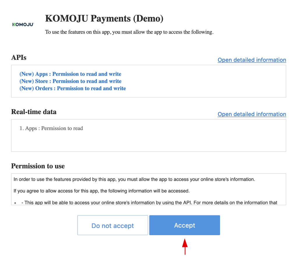 In order to install KOMOJU’s payment gateway app on Cafe24, please allow the listed permissions for the app.