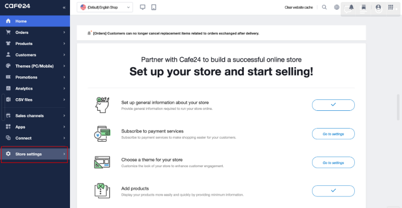 After the initial automated setup is complete, you will be redirected to the Cafe24 Settings page.