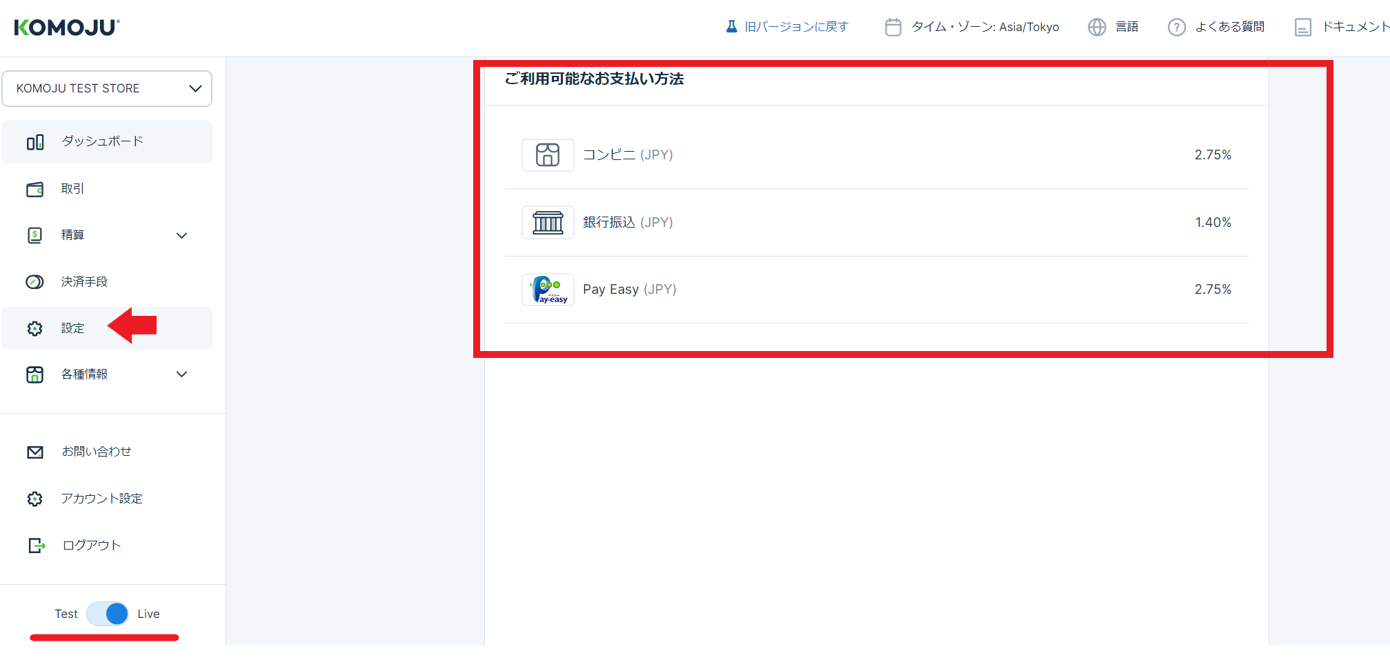 KOMOJUにログインし「liveモード」であることを確認してから「設定」をクリックしてください。