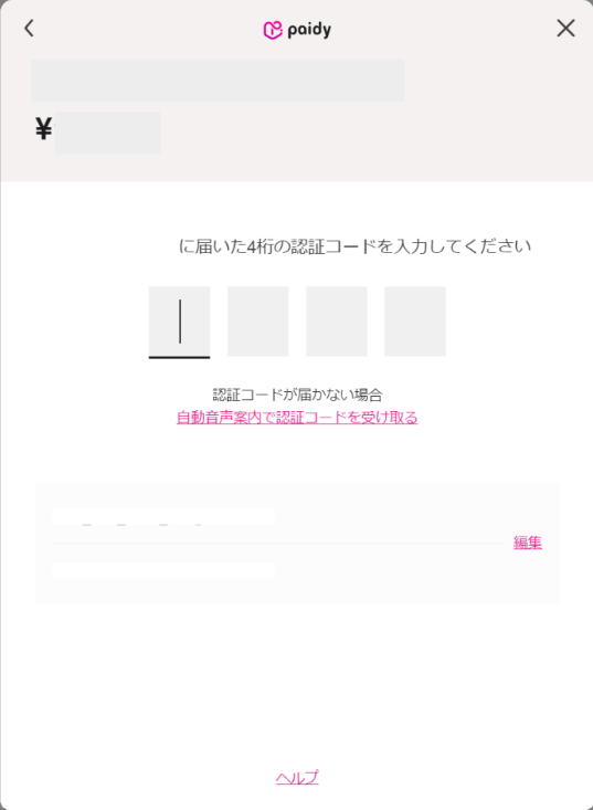 【4】SMSで送信される4桁の認証コードを入力し、決済を完了させる。