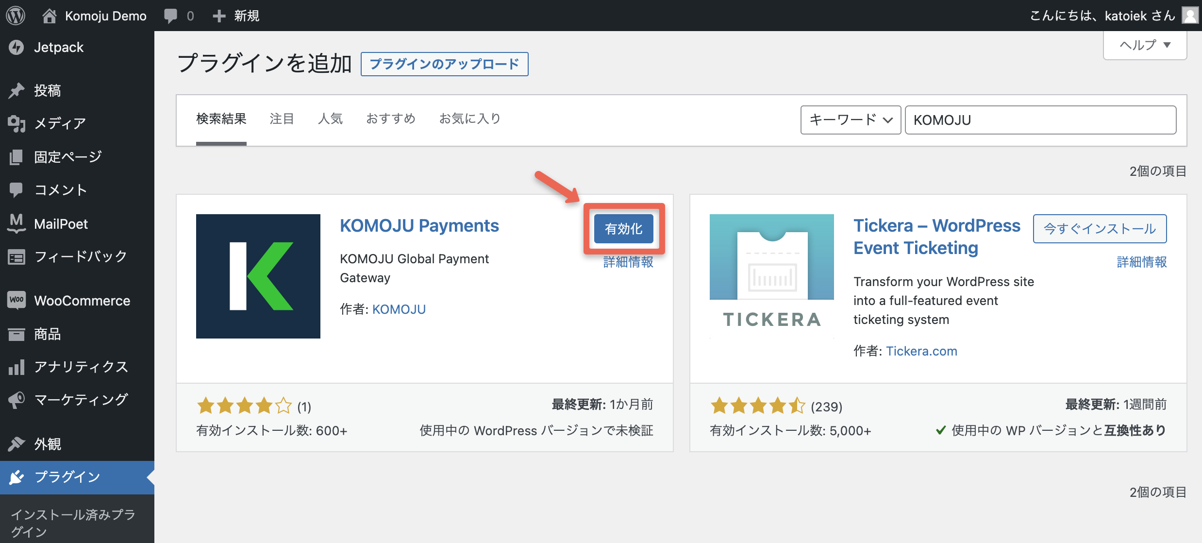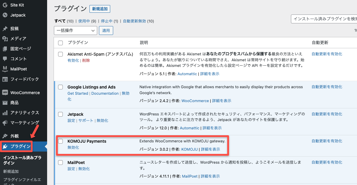 再度プラグインをクリックし、リストにKOMOJU Paymentsプラグインが表示&無効化リンクが表示されていたら成功です。