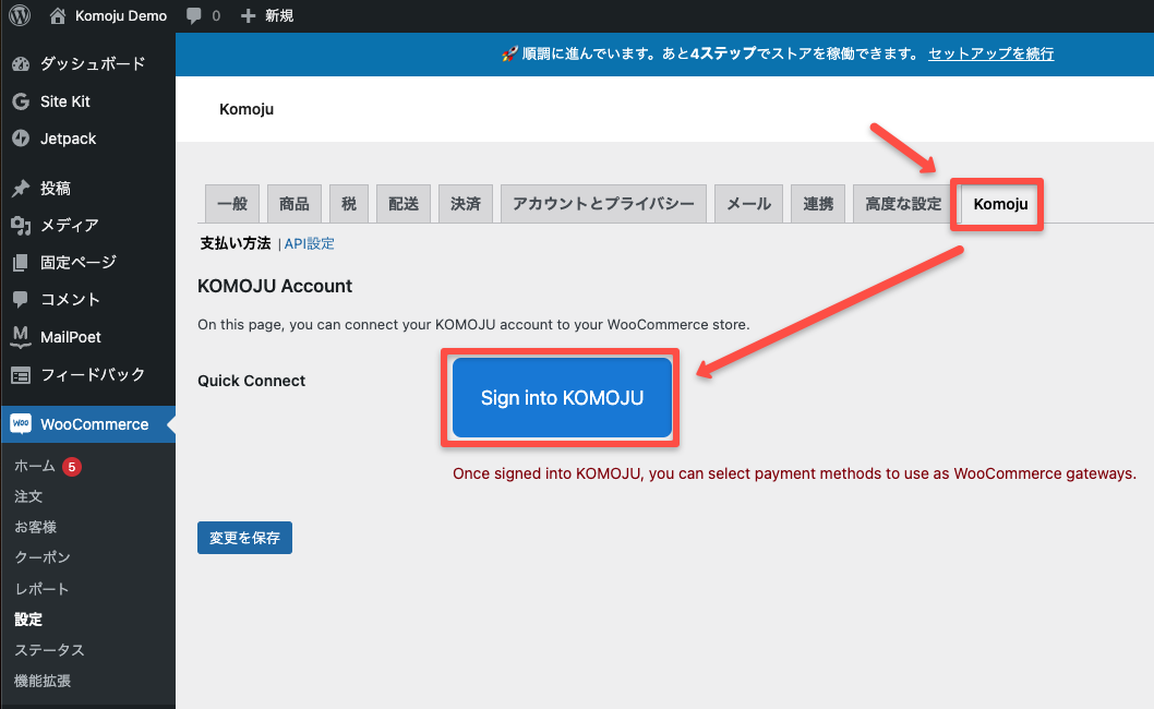 WooCommerce→設定→KOMOJU →[sign into KOMOJU] をクリック
