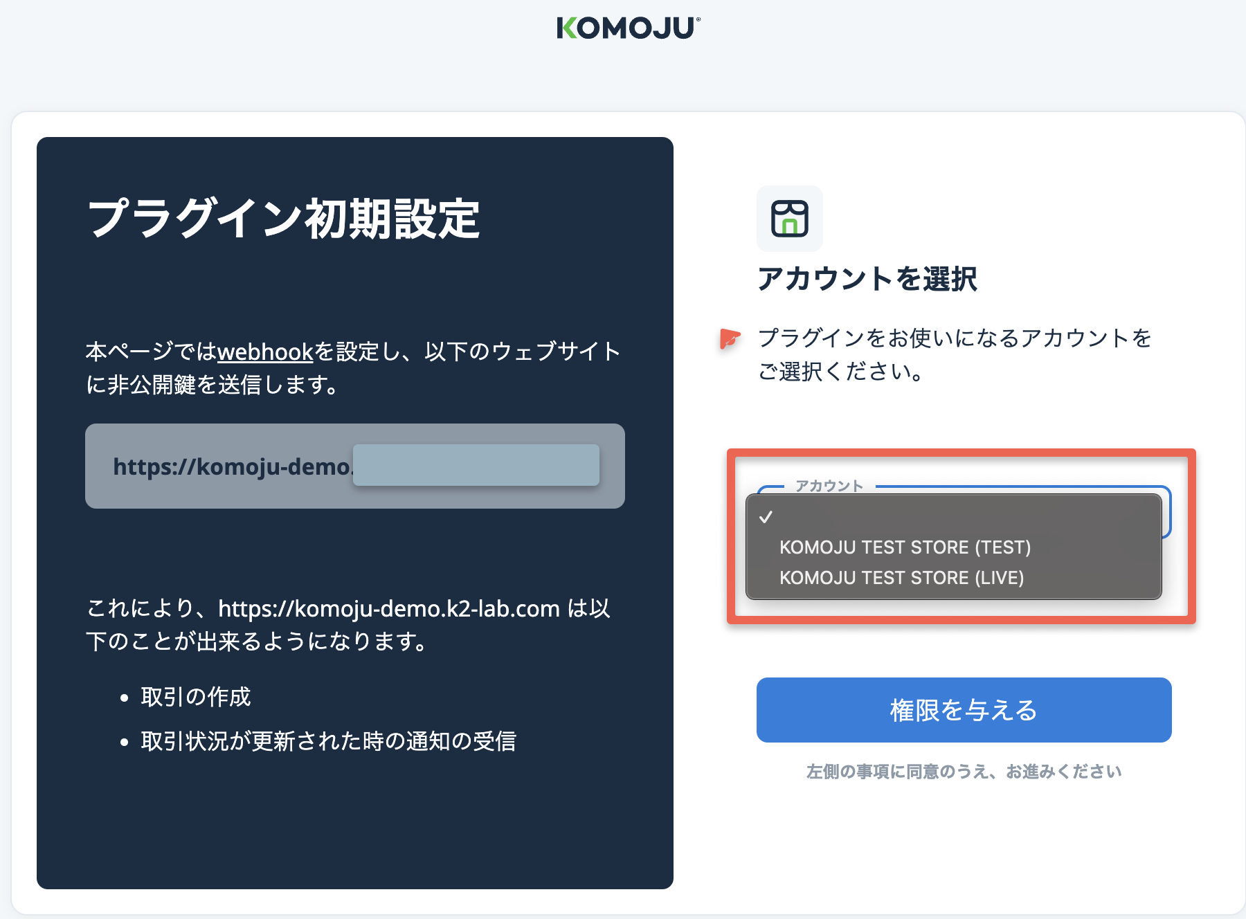 ログイン後、KOMOJUで設定したアカウントを選択できるようになります。