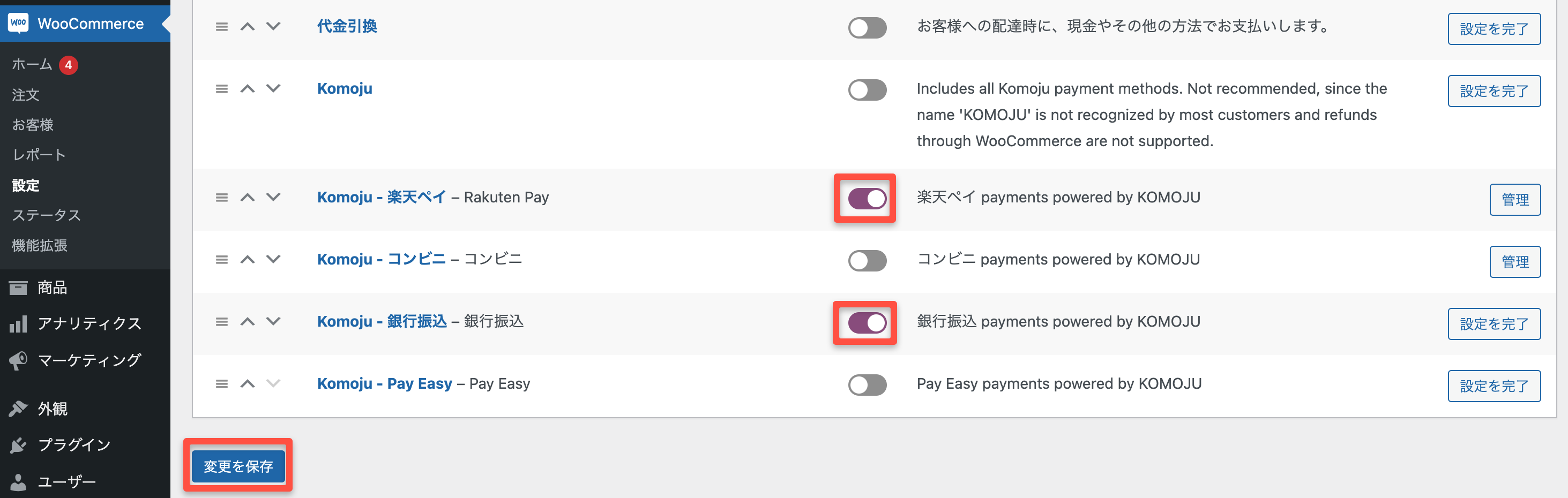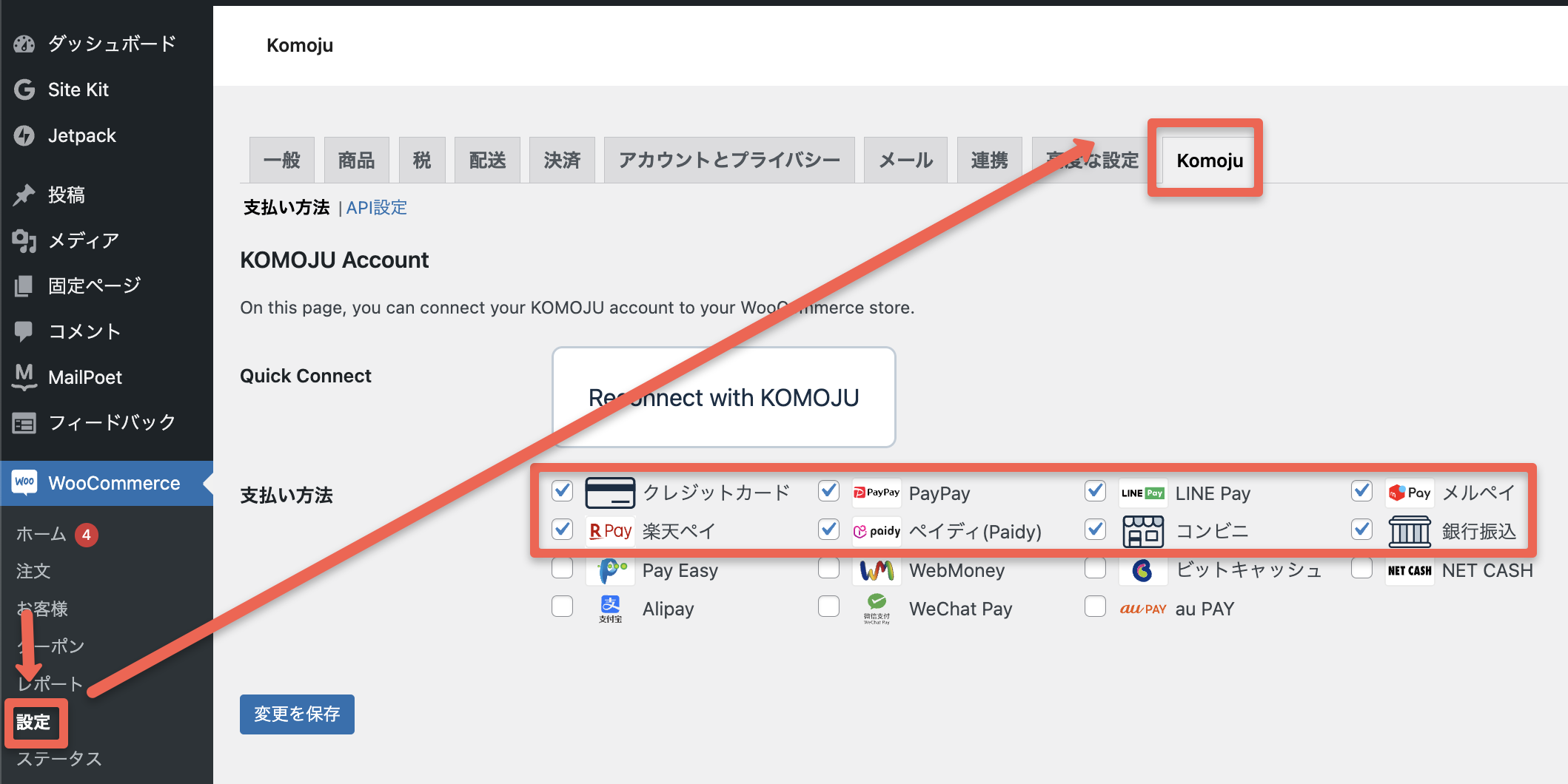 WooCommerceの設定画面からKomojuをクリックし利用したい決済手段にチェックを入れ変更を保存をクリックします。