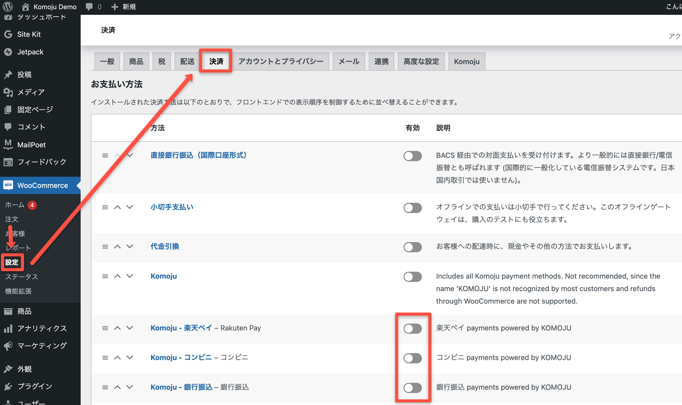 WoredPress、WooCommerceの管理画面に再度遷移します。Komojuタブにて支払い方法が表示されれば成功です。