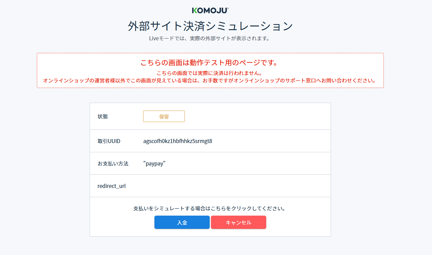 【入金】をクリックいただくことで、取引ステータスを「入金済み」に変更が可能です。 一般公開されているサイトにテストモードを設置されますと、顧客側に下記シミュレーション画面の表示が行われることになりますのでご注意ください。 テストモードは非公開のサイトにてご利用いただくことを推奨しております。