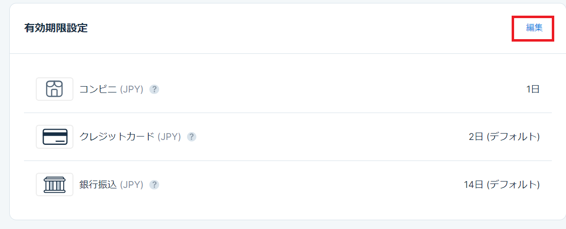 <1> KOMOJU管理画面にログインし、左のメニューから「設定」をクリック し、ページ中ほどにある有効期限設定の欄の「編集」をクリック