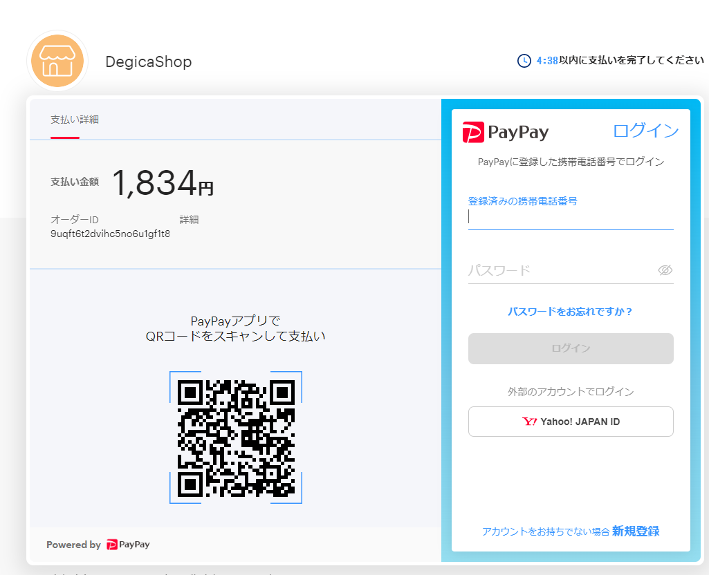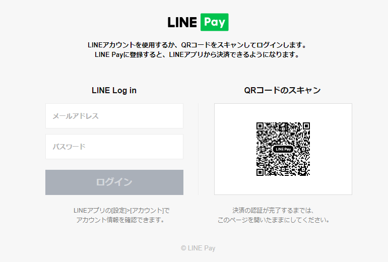 PCをご利用の場合、直接アプリには遷移せずに以下のログイン画面が表示されます。表示されているQRコードをスマホで読み込んでもらうことで各アプリの決済画面が表示されます。