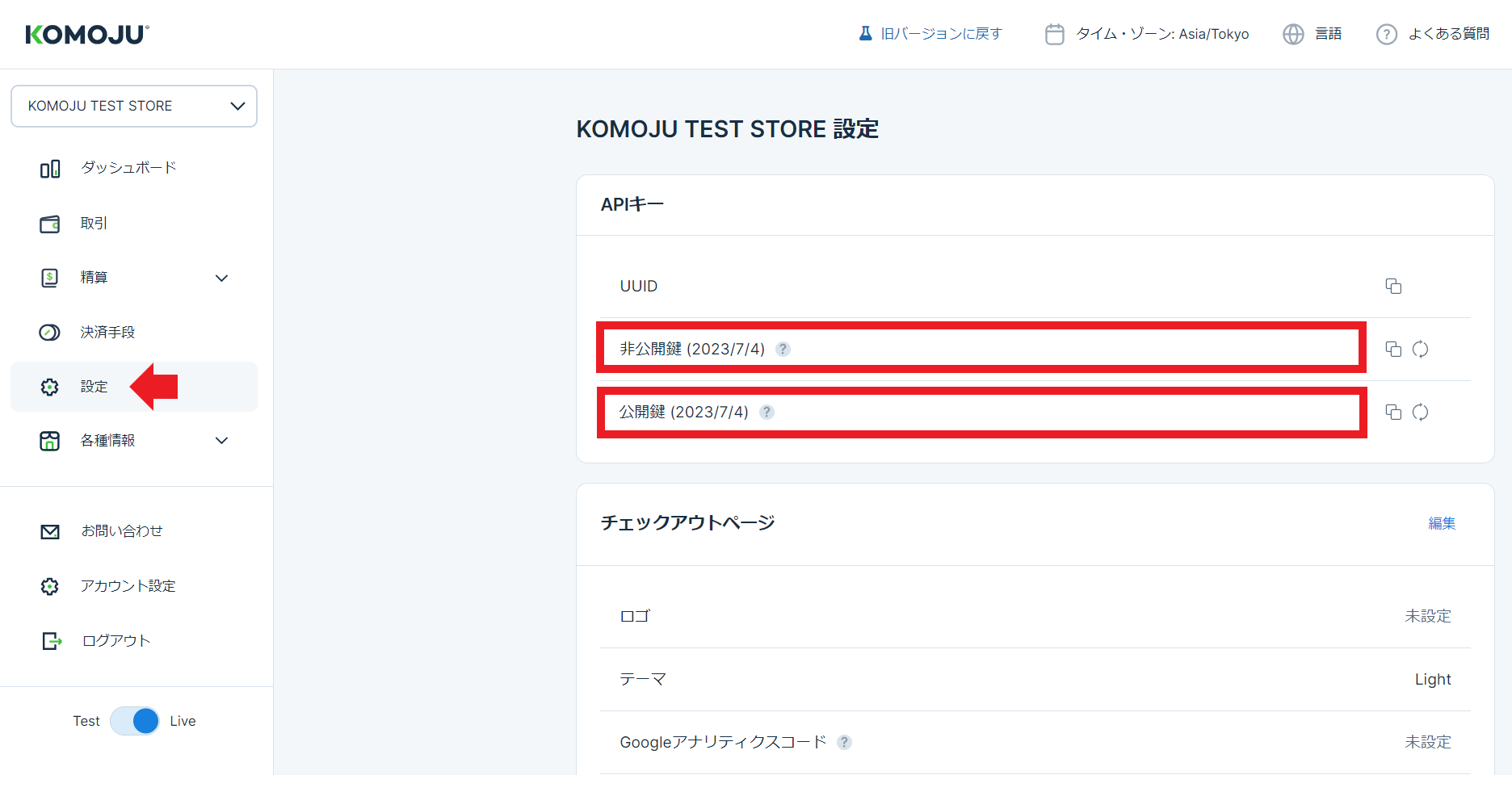 Liveモードに切り替わっていることを確認し、「設定」ページから【非公開鍵】【公開用鍵】をご確認ください