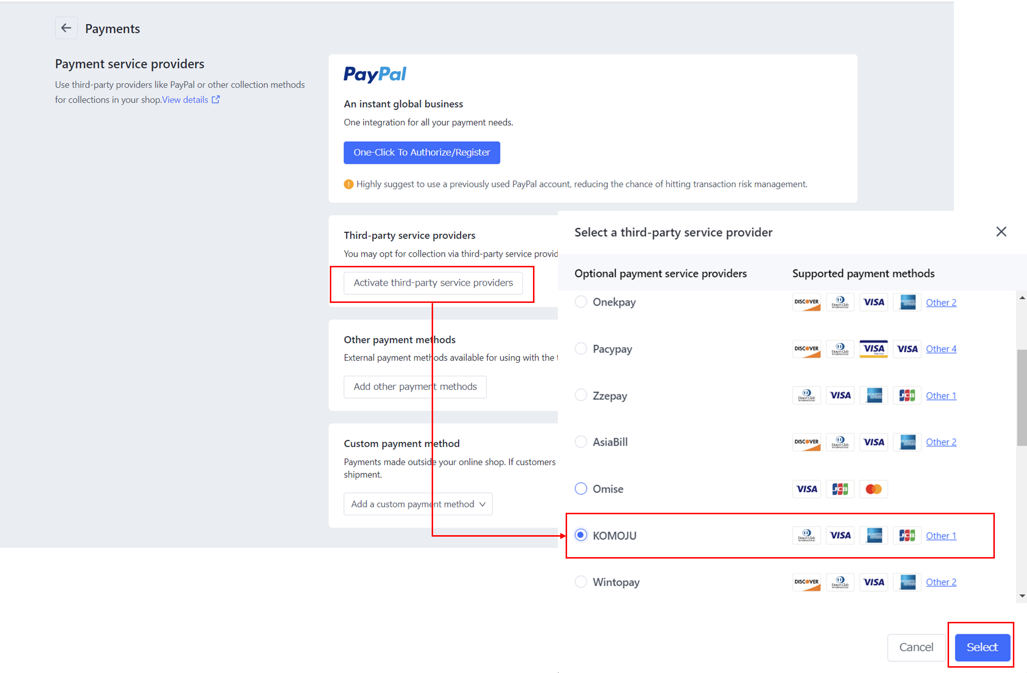 「Activate third-party service providers」 ボタンを押し、「KOMOJU」を選択し「Select」ボタンをクリックしてください。