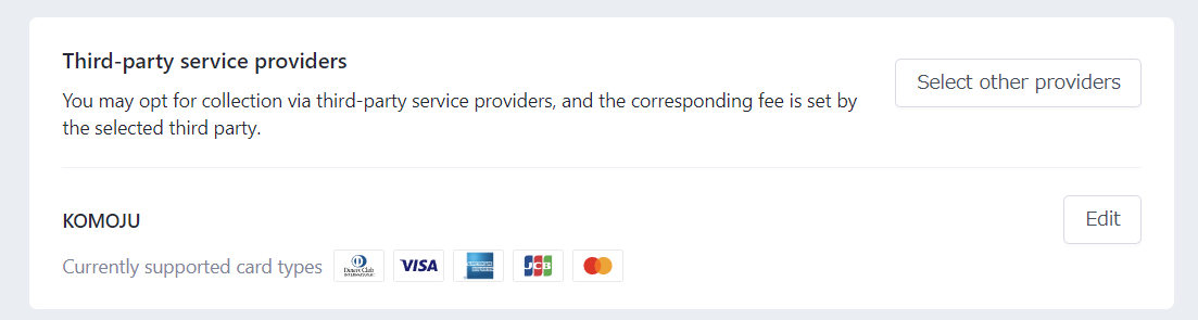 「Third-party service providers」の下にKOMOJUと表示されていれば、KOMOJU設定完了となります。