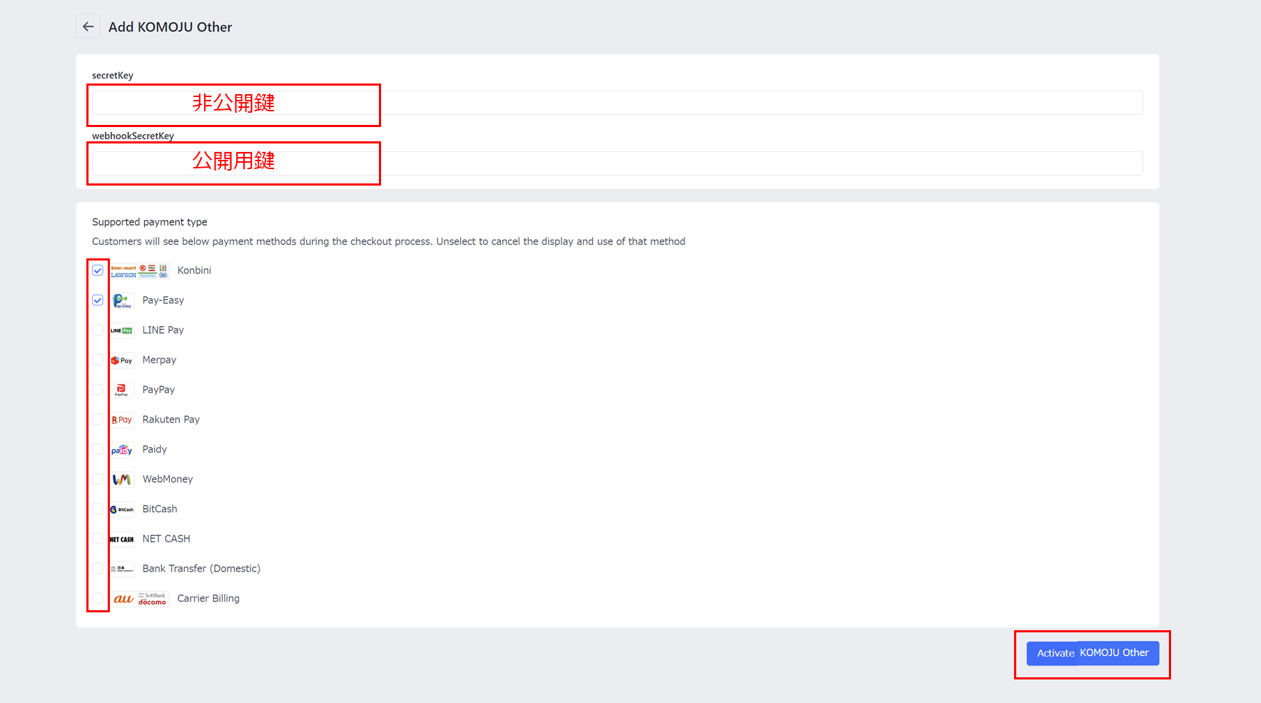 ご利用される決済のアイコンにチェックを入れて、「Activate KOMOJU other」をクリックしてください。