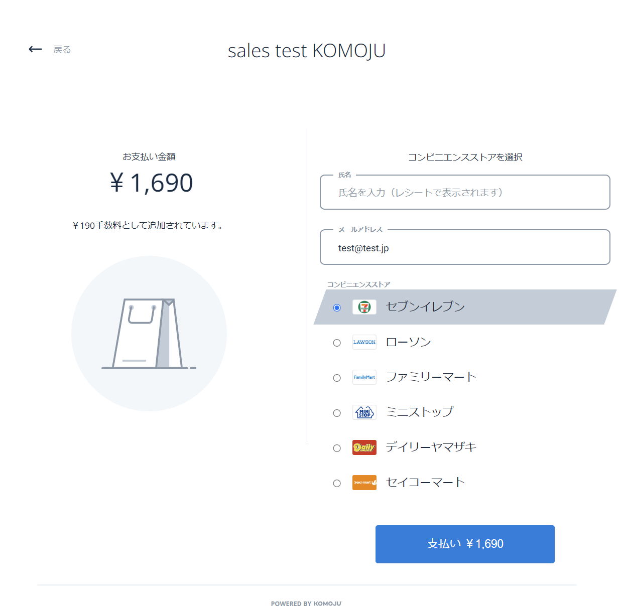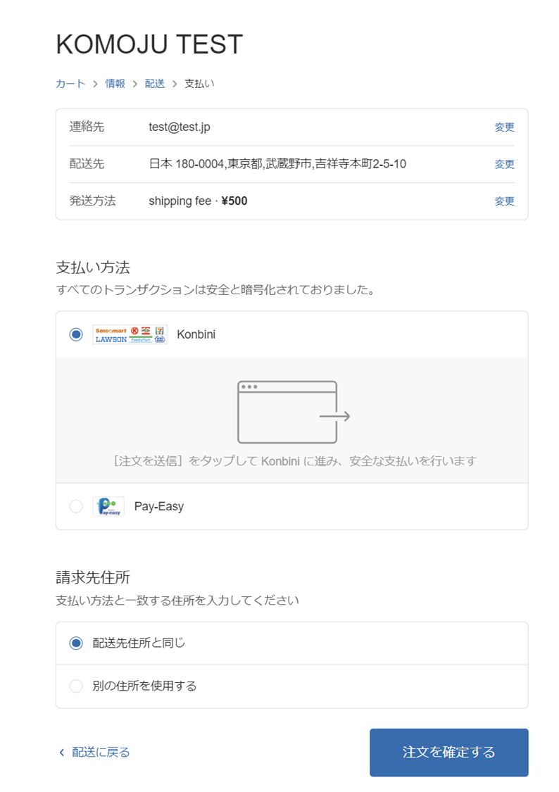 支払い方法選択画面にて設定いただいたKOMOJU決済方法が表示されます。
