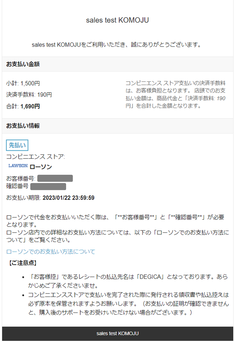 KOMOJUを設定いただいた場合のご注文の流れ(コンビニ支払いの場合)